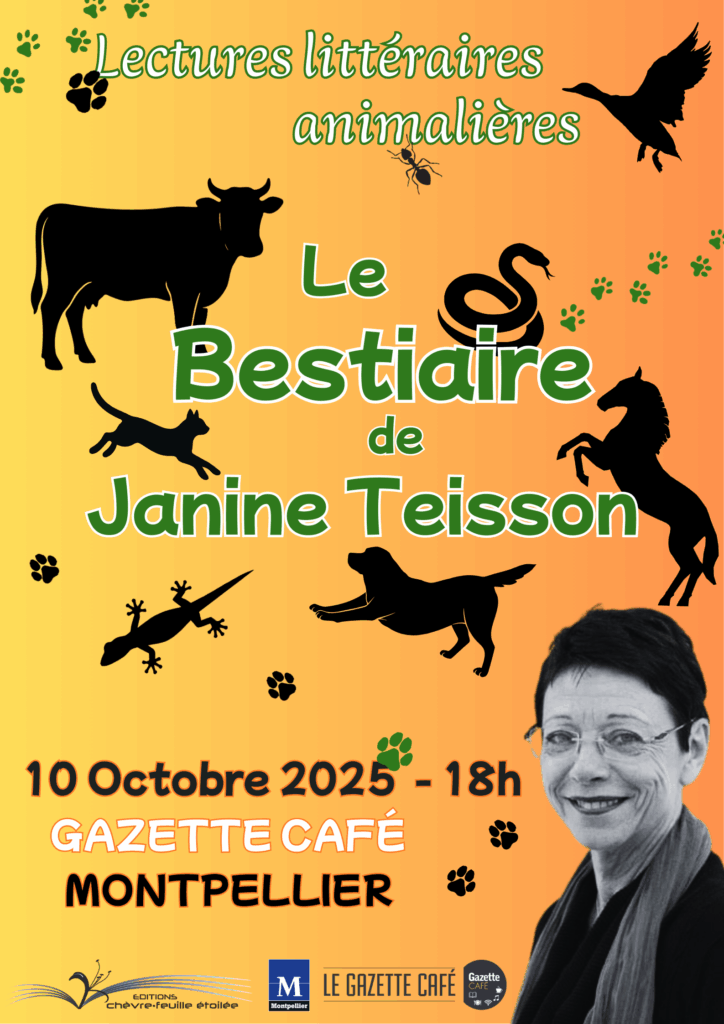 Janine Teisson lira des passages sur le thème des animaux : chevaux, chats, sauterelles, poissons, choisis dans ses nombreux ouvrages Martienne ? et La petite cinglée, Le règne animal, l’enfant plume, Thalasso crime etc…