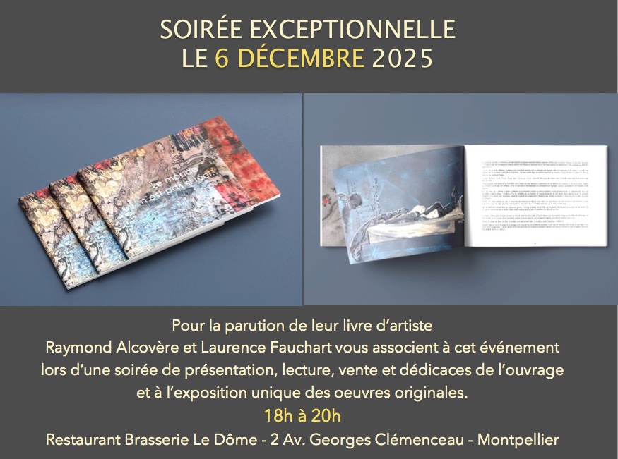 Présentation et lecture de Raymond Alcovère autour de la parution du livre d’artiste : « Le monde n’est pas si réel », 6 déc 2025, Montpellier Posté le25 novembre 202525 novembre 2025AuteurAutour des AuteursLaisser un commentaire Exposition unique des œuvres originales de Laurence Fauchart | samedi 6 décembre 2025, de 18 h à 20 h | brasserie le Dôme, Montpellier