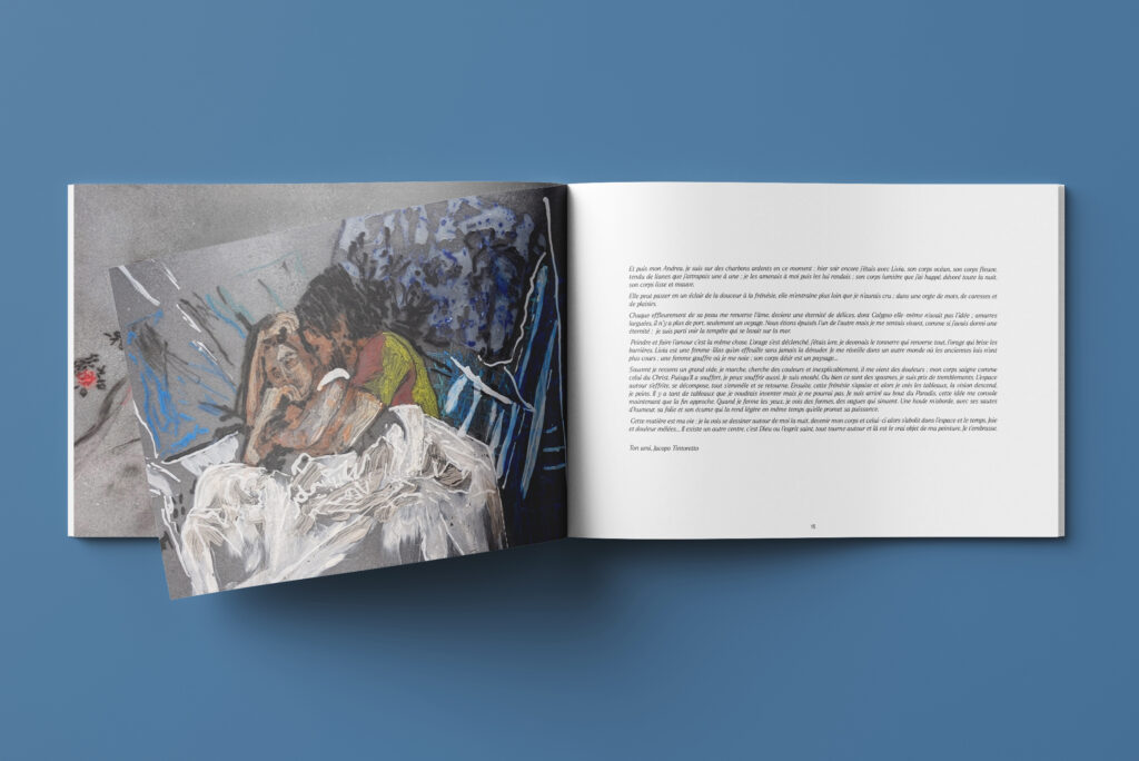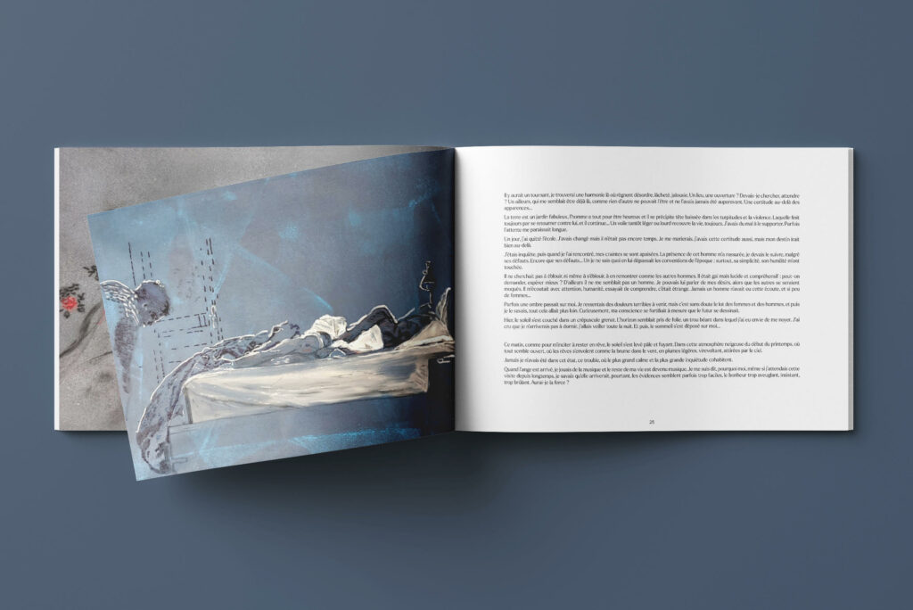 Ce livre d’artiste est issu du croisement de l’univers pictural de Laurence Fauchart et de l’écriture de Raymond Alcovère à travers son recueil de nouvelles « Doubles ». Nos imaginaires respectifs ont rapidement coïncidé et se sont retrouvés pour aboutir à ce livre ; il comporte des textes inédits ainsi que des illustrations originales inédites également. Les œuvres rassemblées ne cherchent pas à illustrer fidèlement les textes mais à dialoguer avec. « Un texte n’existe que s’il est vivant, soit que le lecteur le transforme, soit comme l’a fait ici Laurence Fauchart, qu’un autre artiste se l’approprie, le revisite et l’enrichit. » R.A.