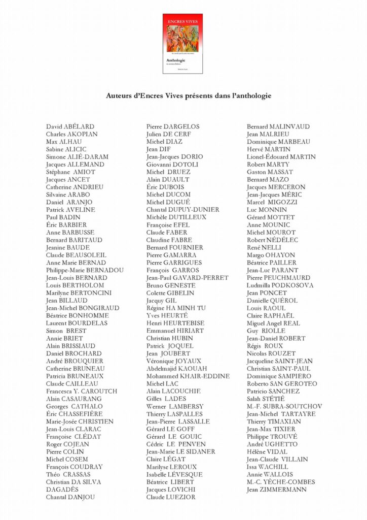 En préface, un petit historique d’Encres Vives par Michel Cosem et un mot du comité de rédaction d’Encres Vives (Annie Briet, Catherine Bruneau, Eric Chassefière, Jean-Louis Clarac, Bernard Fournier, Régine Ha Minh Tu, Gilles Lades, Jacqueline Saint-Jean, Christian Saint-Paul).