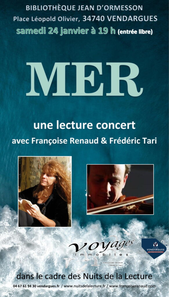 MER, lecture concert de Françoise Renaud | 24 janvier à la bibliothèque Jean d’Ormesson, Vendargues (34) Posté le13 janvier 202613 janvier 2026AuteurAutour des AuteursLaisser un commentaire Une lecture concert du duo Voyages Immobiles Françoise Renaud : textes & voixFrédéric Tari : compositions & violon en savoir plus iciécouter ici