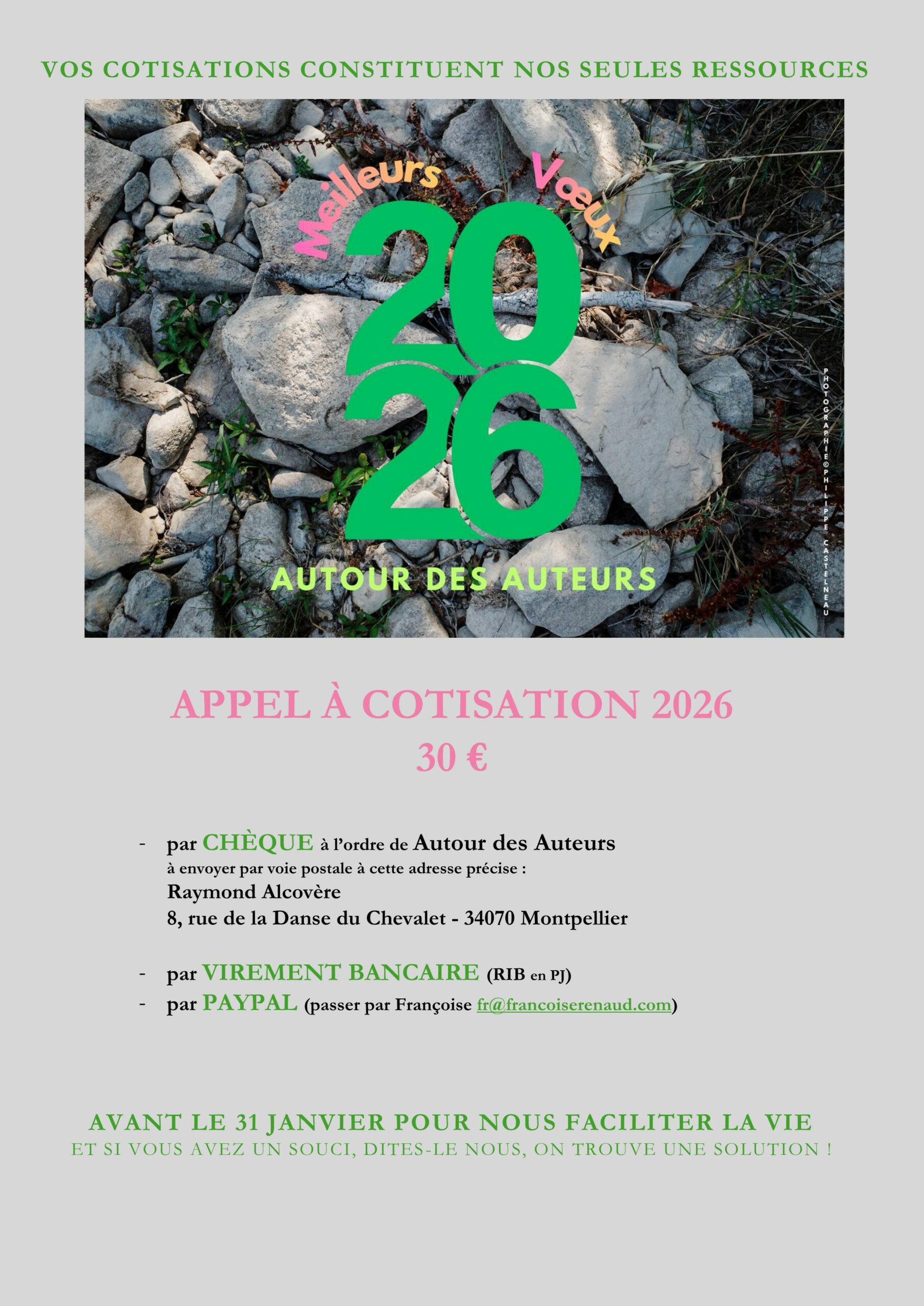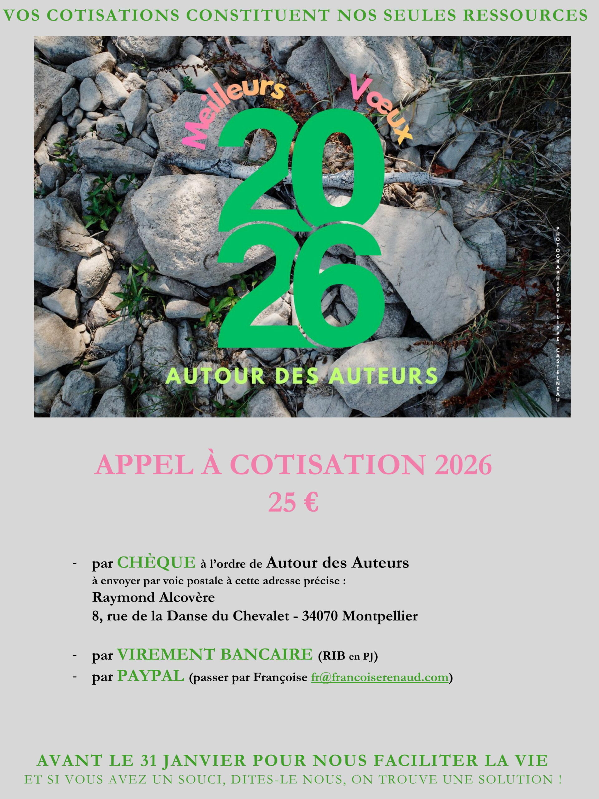 Comme vous le savez, la cotisation couvre votre inscription en tant qu’adhérent de Autour des Auteurs de janvier à janvier et constitue la seule ressource financière de l’association.