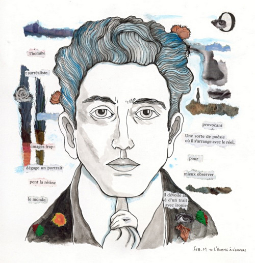 Seb M. a choisi de représenter les écrivains qu’il aime. Ses dessins sont réalisés à l’acrylique et à l’encre, avec des collages sur papier.