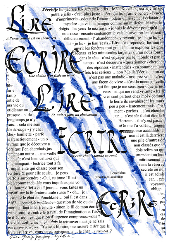 Ils m’entourent et m’encouragent – une nourriture. Ce sont aussi des écritures : toute écriture est précieuse. Je « compare » mon écriture, c’est un besoin (pour faire partie, pour me relier ?). J’« avance » (je suis dans le déplacement) avec des auteurs, des artistes. Ils apportent leurs expériences dans lesquelles je tente de trouver des réponses, à travers les mots, les images. Je vois dans cet intérêt comme une dynamique dans laquelle je recherche un écho à ma propre vie.